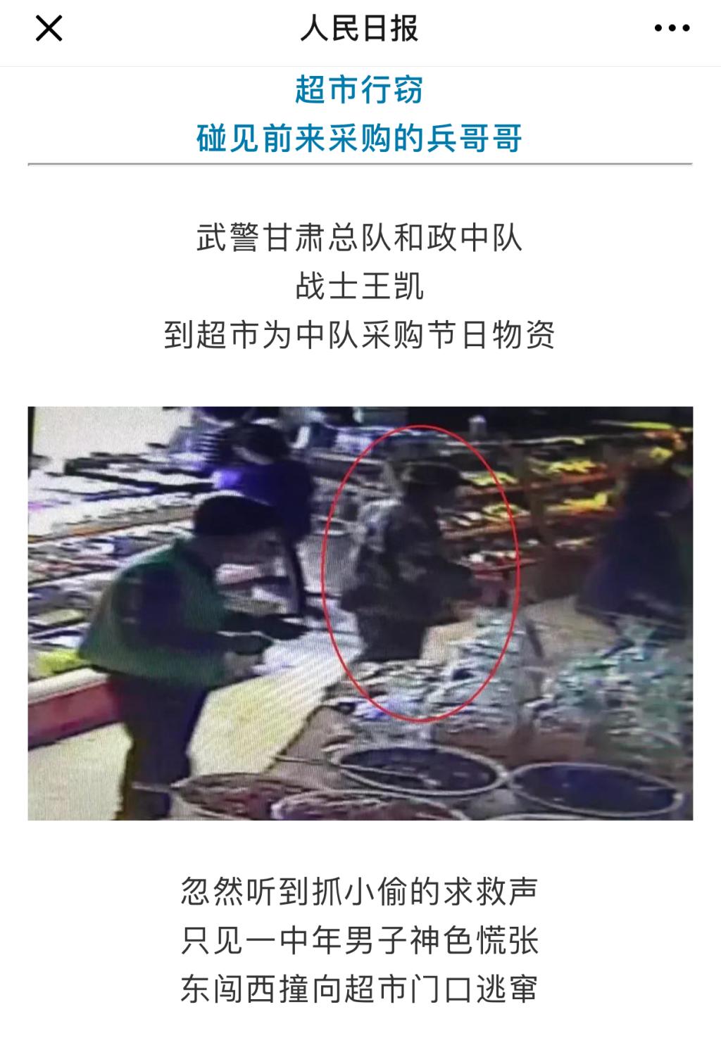 文章这样写道:“武警甘肃总队和政中队战士王凯到超市为中队采购节日物资,忽然听到抓小偷的求救声,只见一中年男子神色慌张,东闯西撞向超市门口逃窜,王凯一个箭步冲上前去双臂紧扣男子脖颈而后夹颈抡摔将其摔倒在地并牢牢控制,在此期间该男子奋力反抗,用肘猛击王凯腹部试图挣开,但是王凯紧扣其脖颈,直至警察赶到现场。”